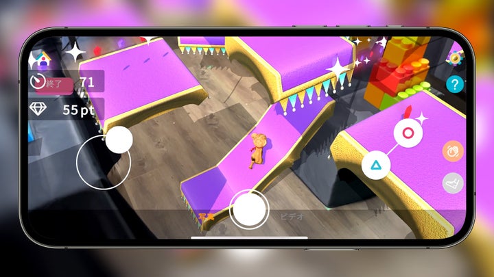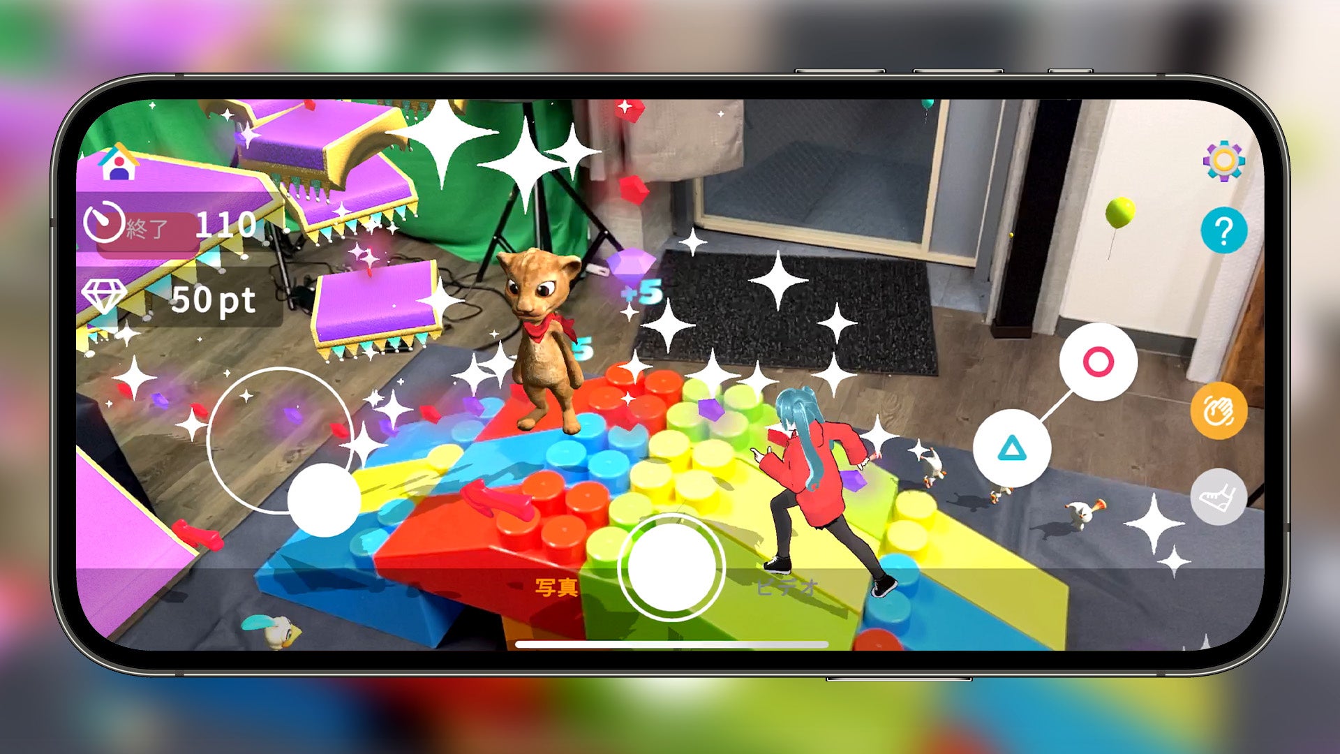 このゲームは、現実世界とARのブロックで構成されたフィールドでクリスタルを集めてゴールを目指すアクションゲームです。
