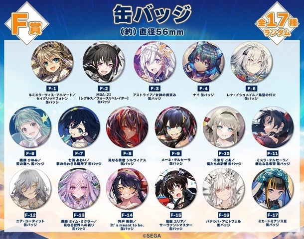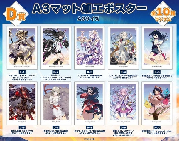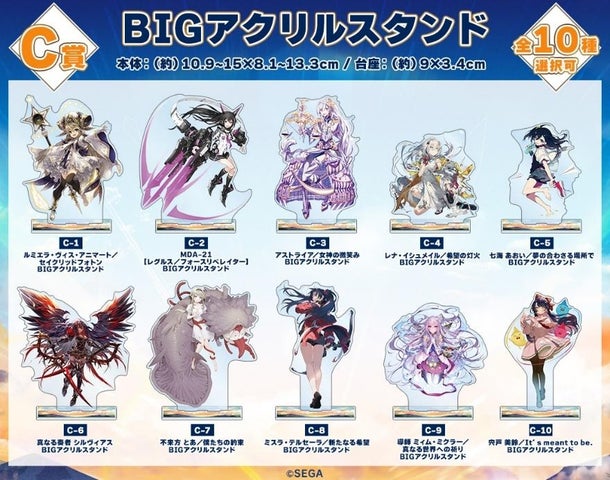 景品ラインナップには、ほぼ等身大タペストリーやプレイマット、BIGアクリルスタンド、A3マット加工ポスター、アクリルキーホルダー、缶バッジなどがあります。