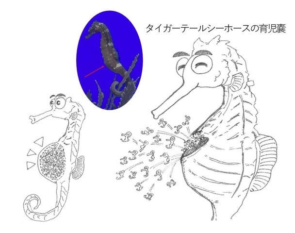 タツノオトシゴの特徴的な繁殖方法は、オスが卵を受け取り、育児嚢で保護し、孵化するまで育てることです。