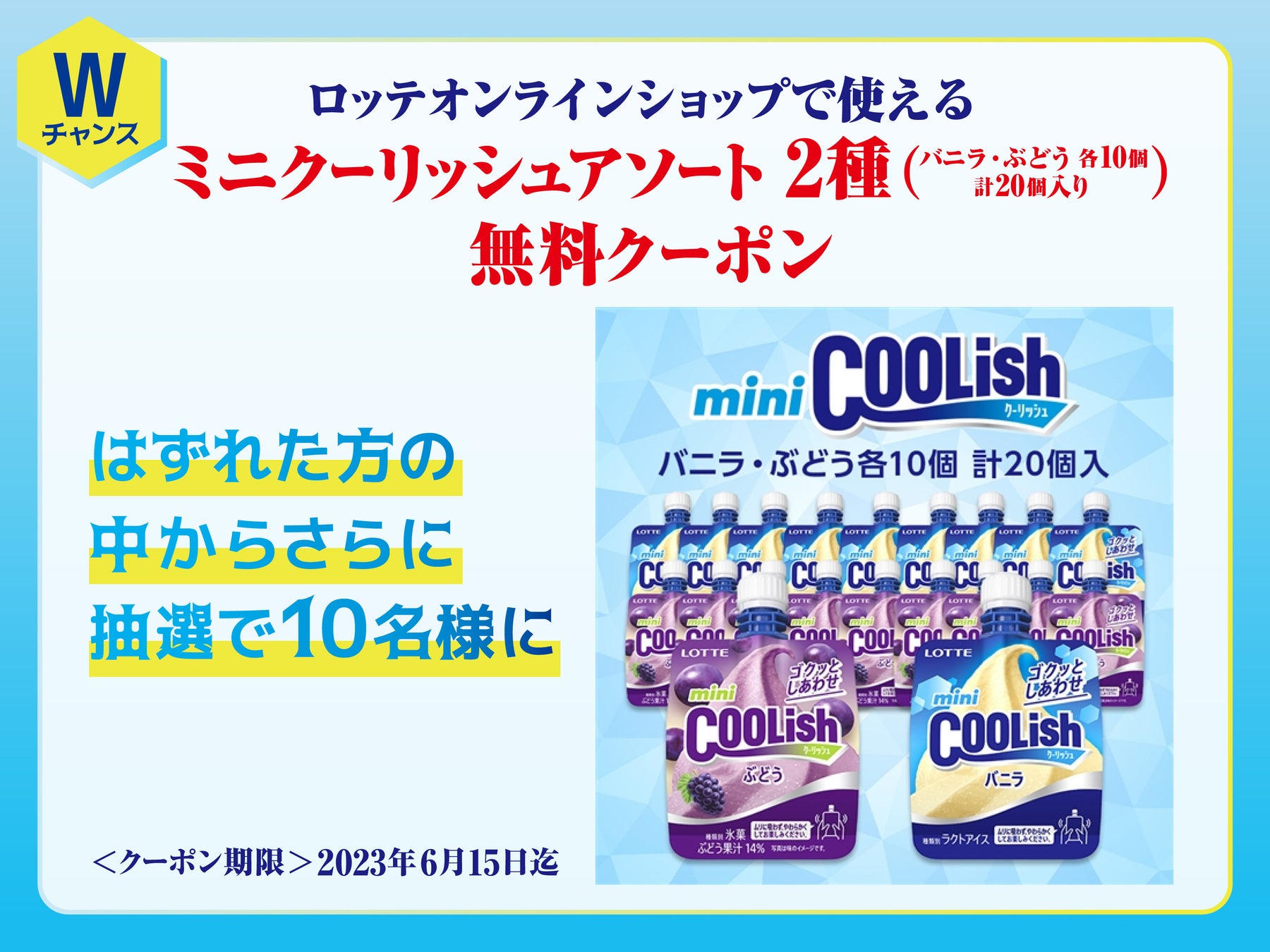さらに外れた方の中から「ロッテオンラインショップで使えるミニクーリッシュアソート2種×10個入無料クーポン」を抽選で10名様にプレゼント
