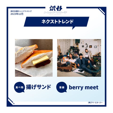 最後に、高校生が注目する「ネクストトレンド」では、「揚げサンド」という新感覚のパンや「berry meet」というスリーピースロックバンドが注目されています。