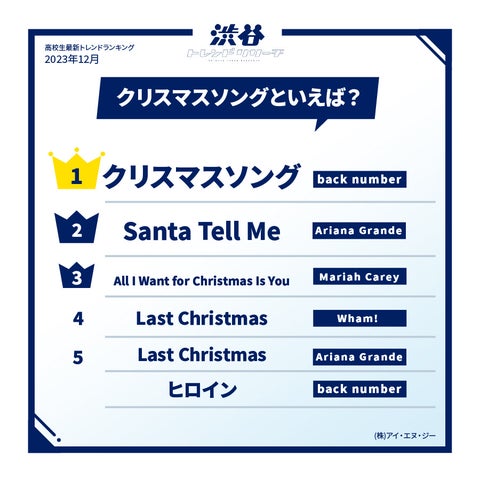 今年の高校生が選んだ「クリスマスソング」の調査結果では、1位には「back number」の「クリスマスソング」が選ばれ、2位には「Ariana Grande」の「Santa Tell Me」、3位には「Mariah Carey」の「All I Want for Christmas Is You」がランクインしました。