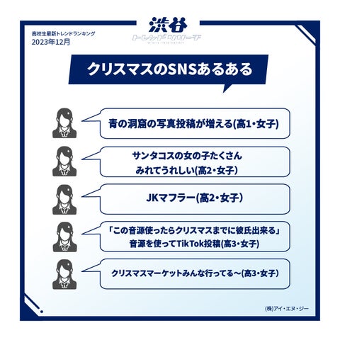 さらに、高校生が思う「クリスマスのSNSあるある」では、イルミネーションや恋人に関する投稿が多く寄せられました。