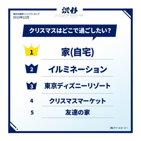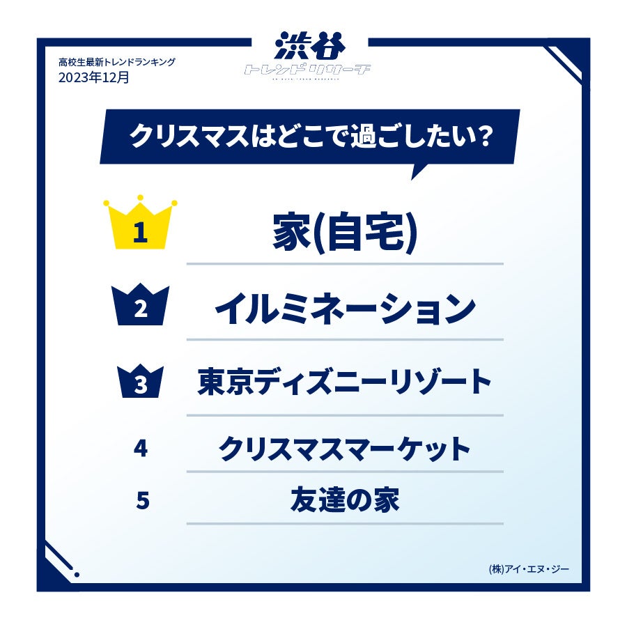 また、高校生たちがクリスマスを過ごしたい場所の調査結果では、1位には「家(自宅)」が選ばれ、2位には「イルミネーション」、3位には「東京ディズニーリゾート」がランクインしました。