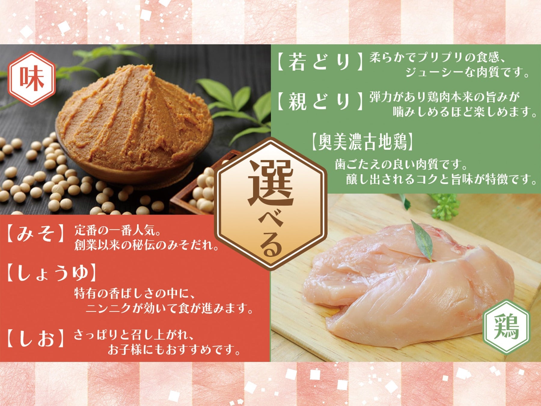 味や鶏肉の種類を選べるため、9種類のケイちゃんを楽しむことができます。