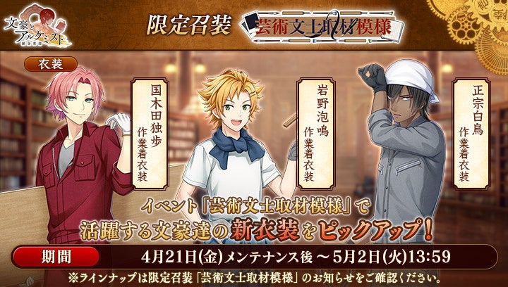 さらに、イベントと同時に開催される限定召装『芸術文士取材模様』にて新規追加された「岩野泡鳴」「正宗白鳥」「国木田独歩」の〈作業着衣装〉を編成すると、得点の獲得率がそれぞれ30%上昇します。