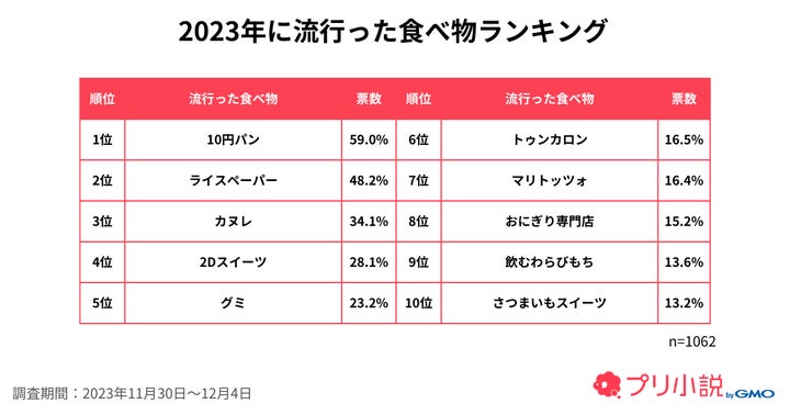 流行した食べ物の1位は「10円パン」で、韓国で流行した10ウォン硬貨をデザインした菓子パンが人気となりました。