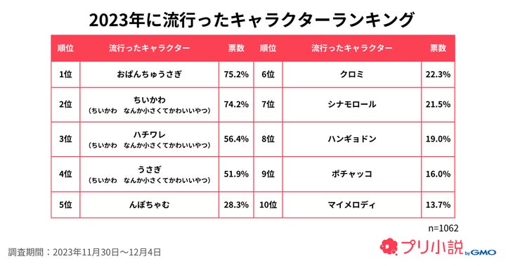 流行したキャラクターの1位は「おぱんちゅうさぎ」で、可哀想に!さんが手がけたキャラクターが人気となりました。