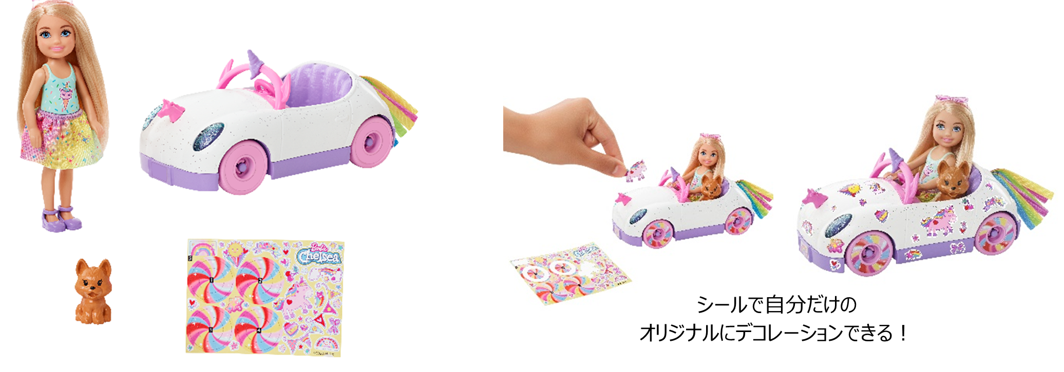チェルシーとペットの子犬、ユニコーンにインスパイアされたかわいらしいオープンカーでドライブを楽しめるプレイセットです。オープンカーはキラキラした白いボディとパープルの縁取り、ユニコーンのオーナメントとレインボーのしっぽがついた、ファンタジックなデザインになっています。また、付属のステッカーシートで車を自由にカスタマイズもできます。チェルシーはかわいいピンクのサングラス、パープルのくつ、ユニコーンをテーマにしたトップス、星のついているスカートを着ておしゃれも楽しみながら遊ぶことができます。