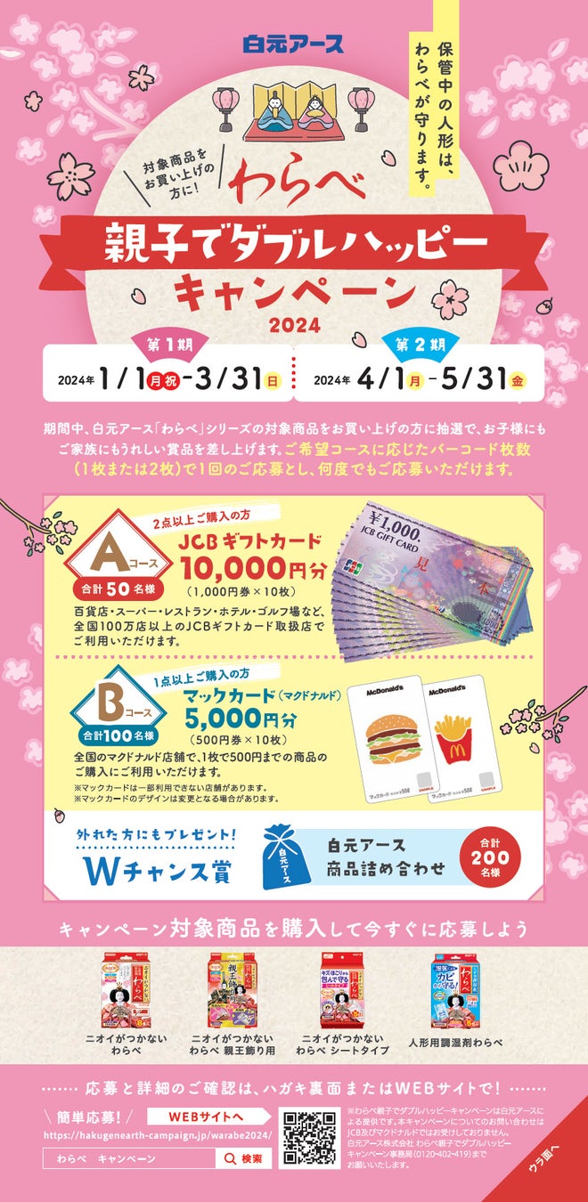 白元アース株式会社は、人形用ケア商品「わらべ」シリーズを購入し応募すると、抽選で「JCBギフトカード10,000円分」や「マックカード(マクドナルド)5,000円分」が当たるキャンペーンを2024年1月1日から実施します。