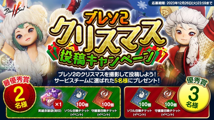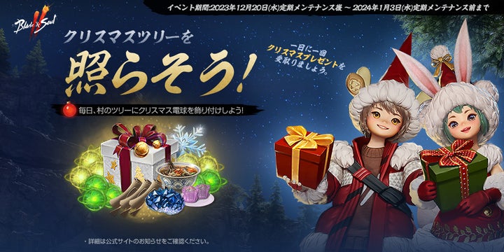 - マスターダンジョン、クリスマスイベント、世界中のプレイヤー、鐘の音の半月湖、クリスマスツリー、クリスマス投稿キャンペーン、年末年始配信キャンペーン、アクションMMORPG、キャラクター操作、ソウルの装着、連携技、バトル