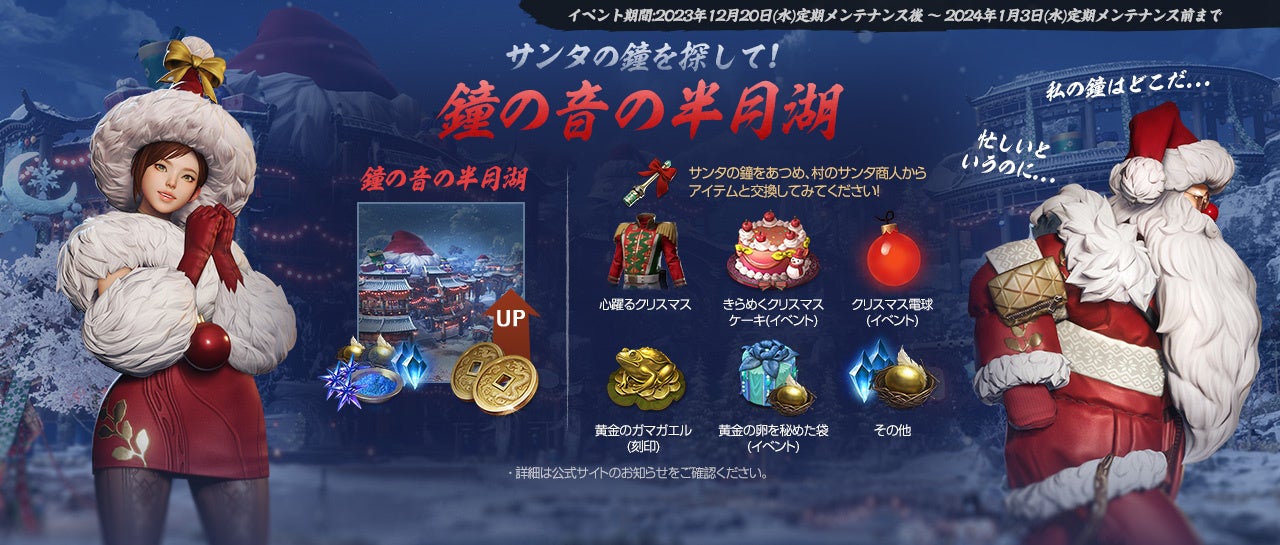 - クリスマスイベントではイベントダンジョン「鐘の音の半月湖」やクリスマスツリーの飾り付けなどが行われ、特別な衣装やアイテムと交換可能