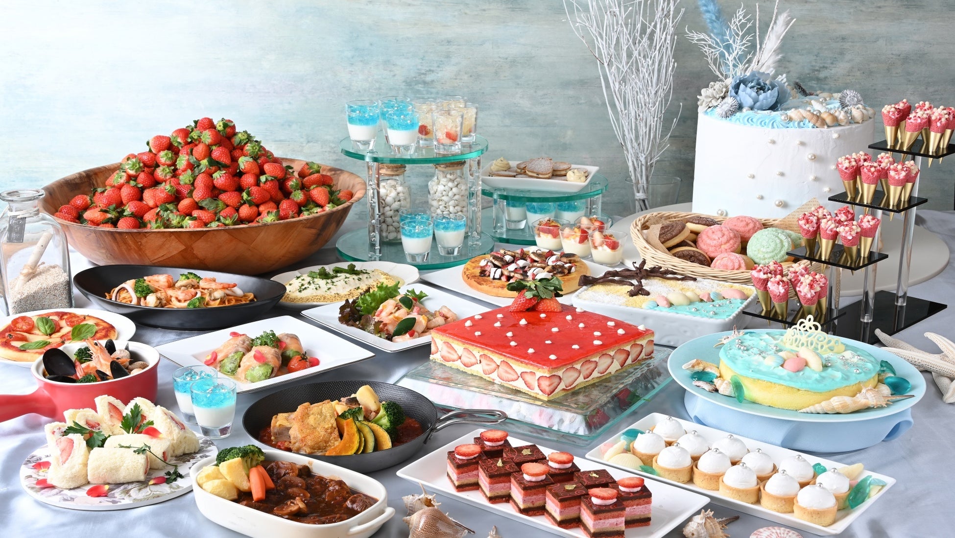 - 海をテーマにしたメニューで、山盛りいちごや海のテーマのスイーツを楽しめる