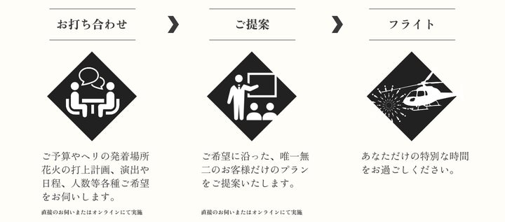 このサービスでは、ヘリコプターでのクルーズとプライベート花火をセットにしたオリジナルイベントをご提案いたします。