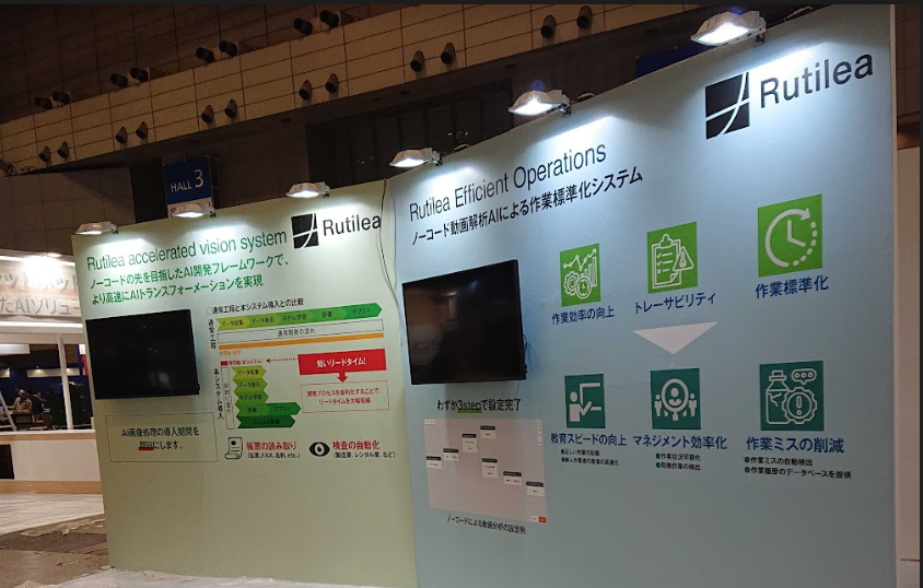 同社のブースでは、ノーコードAIのImageProや動画分析AIのRutilea Efficient Operationsなどが紹介される。