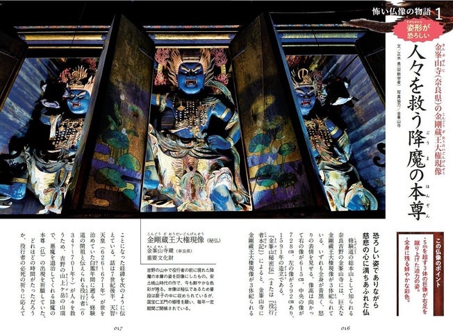 - 明王や閻魔大王、金剛力士など、怖い姿を持つ仏像の造立経緯も紹介されている