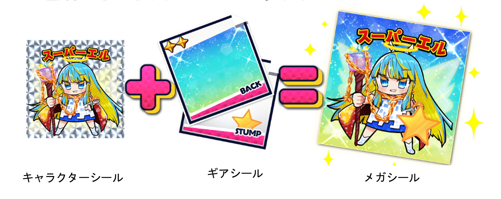 「キャラクターシール」と「ギアシール」の組み合わせにより、プレイヤーだけの「メガシール」を作ることができます。