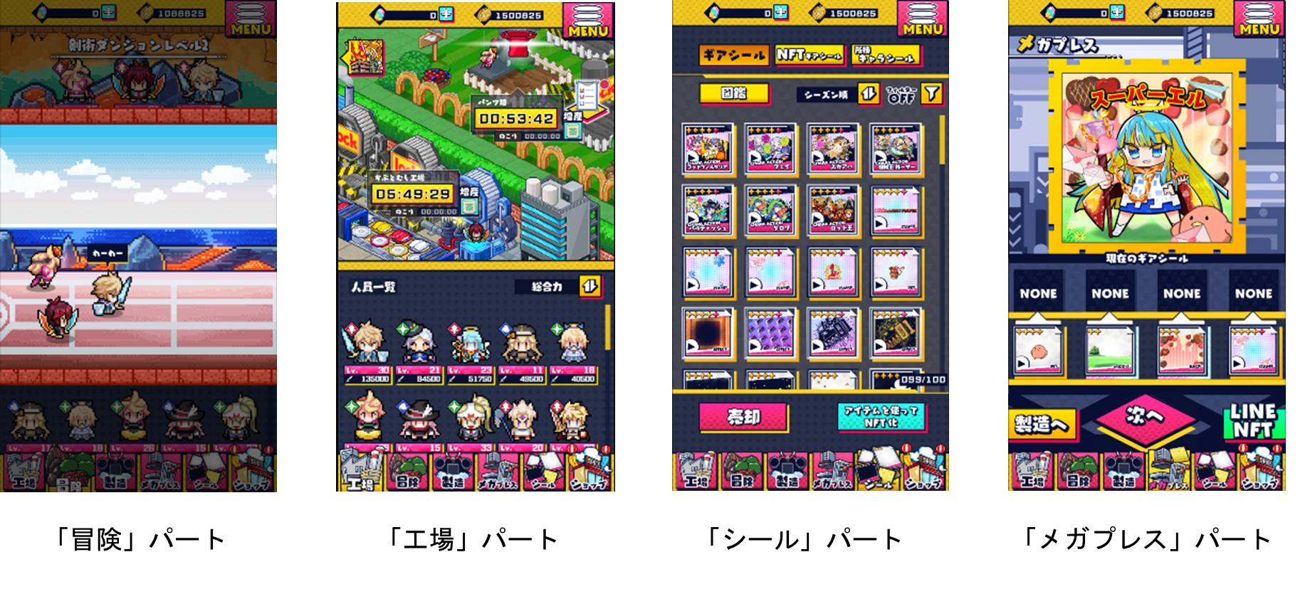 「製造」パートでは、生産した「パンツ」を使って「ギアシール」を作ることができます。「ギアシール」は、ゲームコンテンツでのみ入手できる全120種類のシールフレームで、「シール」パートでNFT化することで「メガプレス」パートでお持ちの「キャラクターシール」と合成できるようになります。
