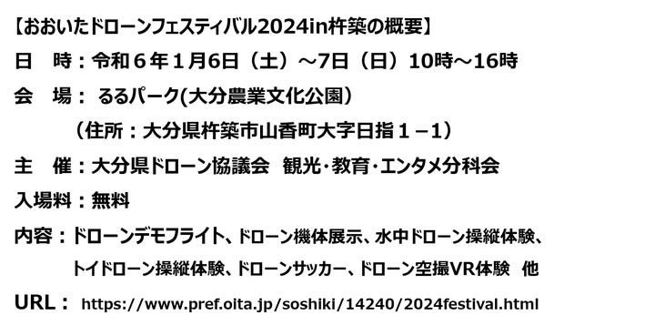 株式会社オーイーシーは、大分県ドローン協議会観光・教育・エンタメ分科会がるるパークで開催する「おおいたドローンフェスティバル 2024 in 杵築」に参加します。