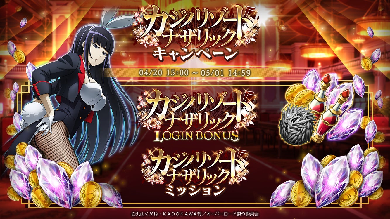 また、カジノリゾートナザリックキャンペーンも開催され、ログインボーナスやミッションでゲーム内アイテムが獲得できる。