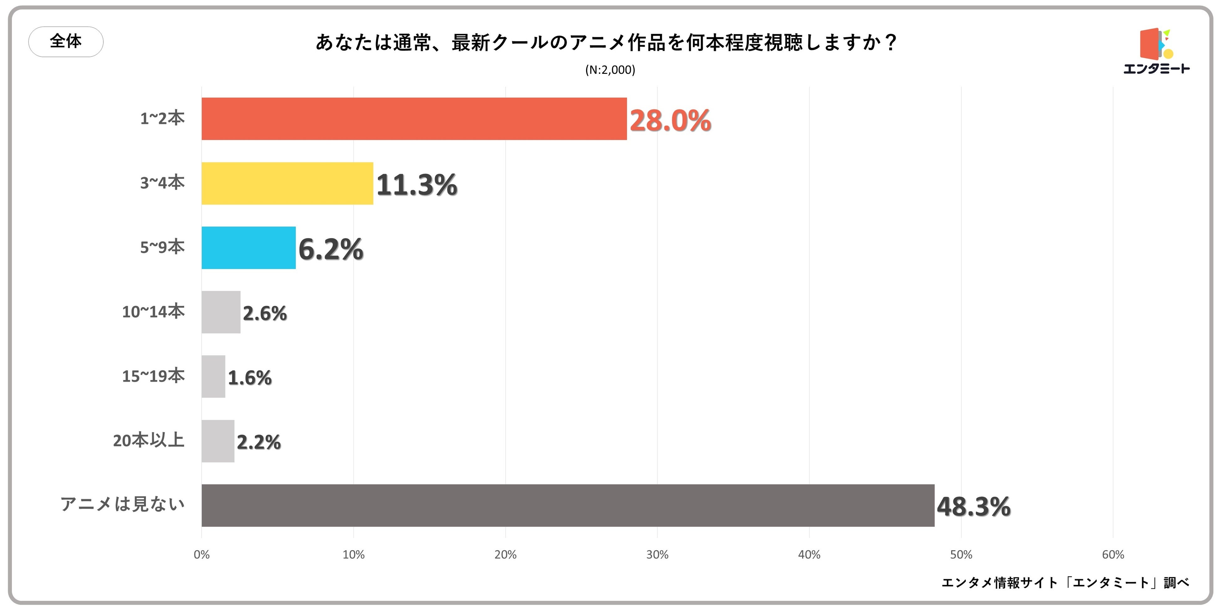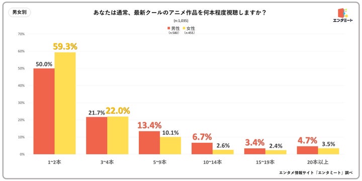 最新のアンケート調査では、全国の10代から50代の男女2,000人を対象に、「最新クールのアニメ作品を何本程度視聴するか」という質問を行いました。