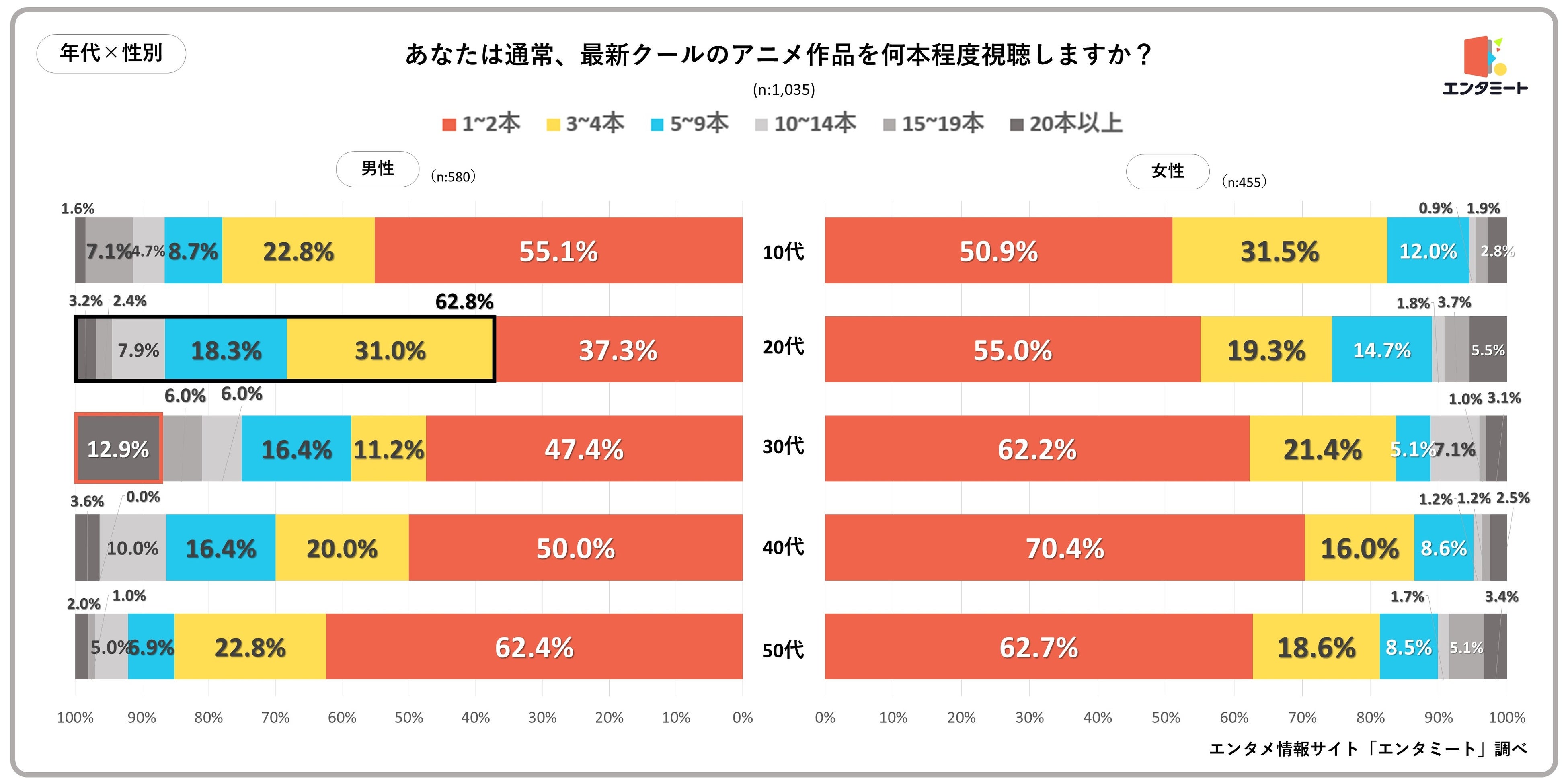 - 1~2本を視聴する人が最も多く、特に20代男性が多い