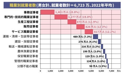 - 事務職、専門技術職、生産工程従事職、販売職、サービス職
