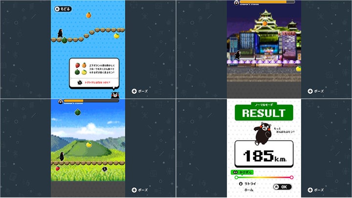 ゲームでは、くまモンが熊本県の特産品を集めながら走り続ける様子を操作します。
