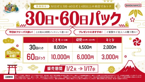 バンダイナムコアミューズメントは、東京都立川市にある『屋内・冒険の島 ドコドコ』で、2024年1月2日から1月17日までの期間限定で『30日パック』と『60日パック』を販売します。