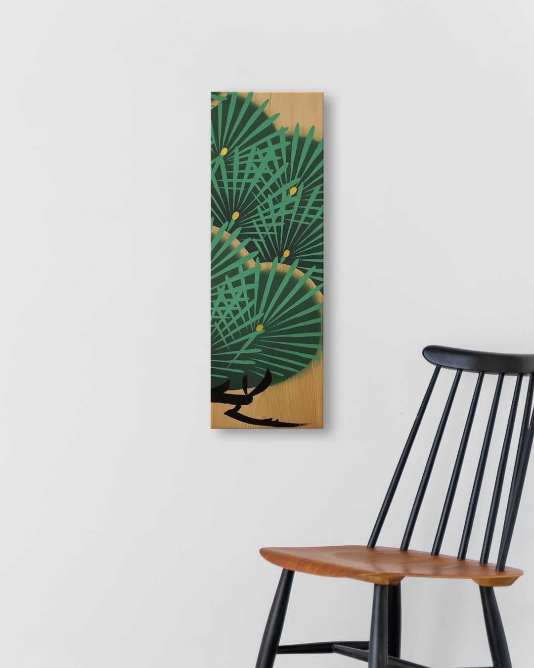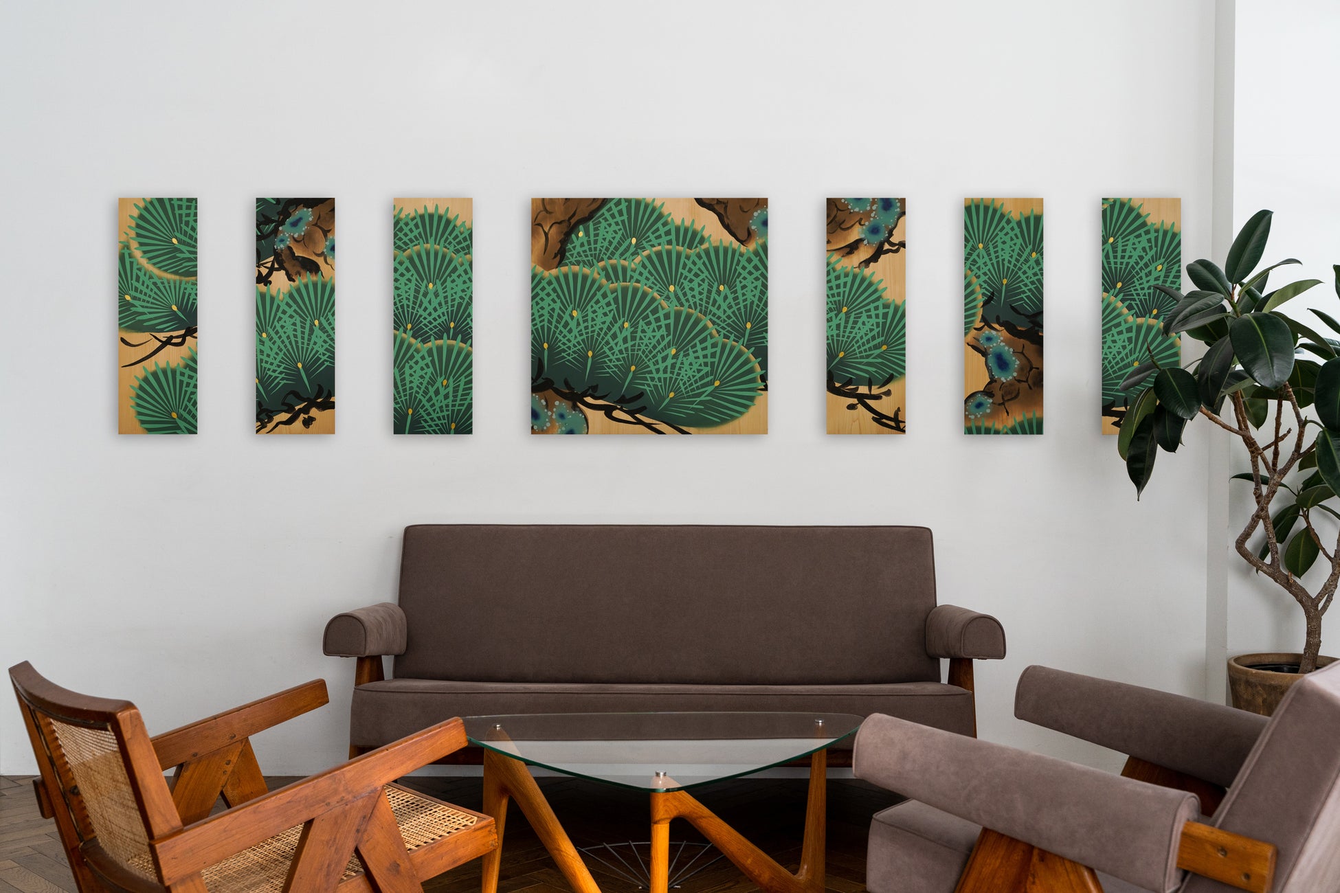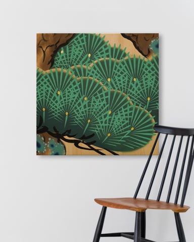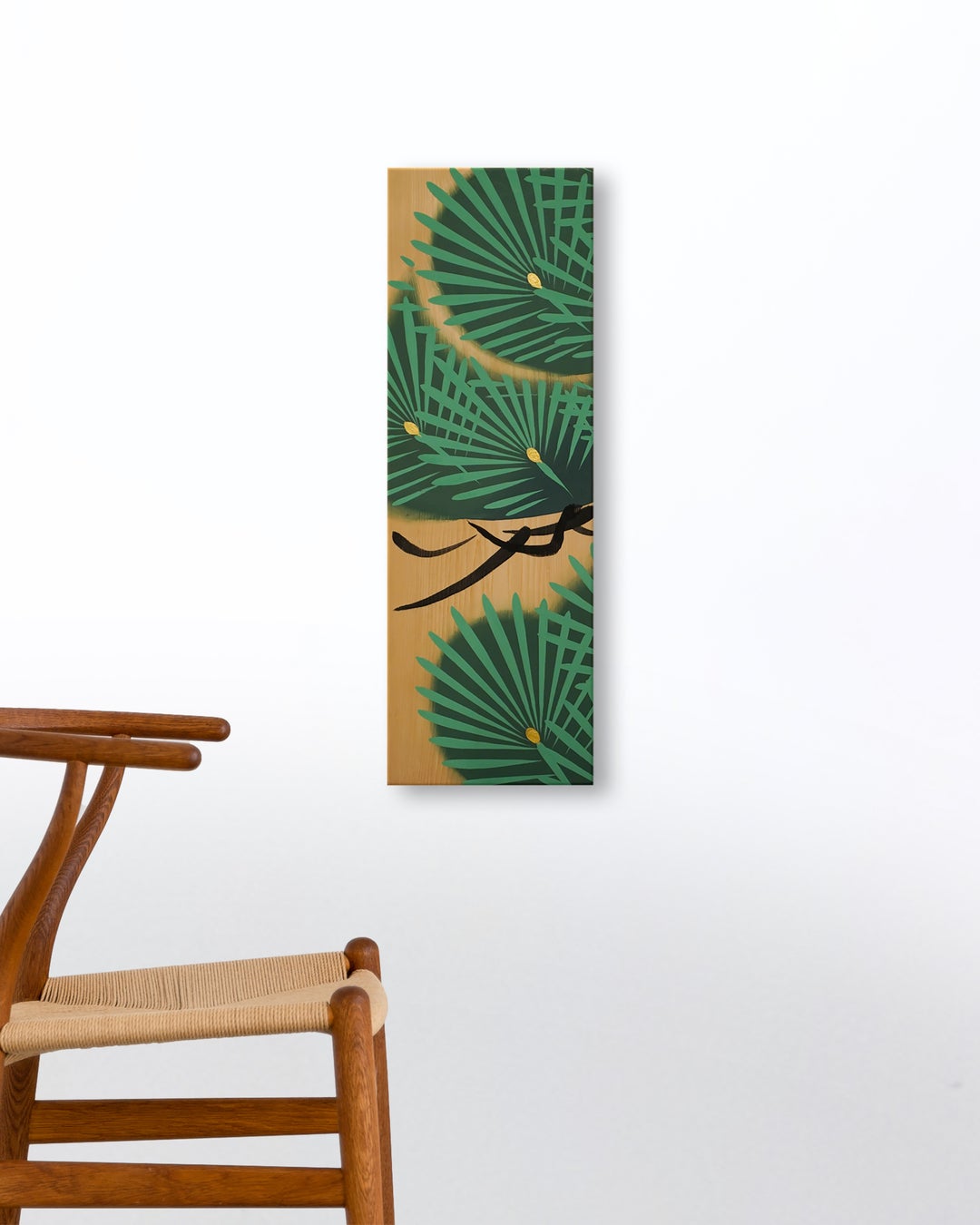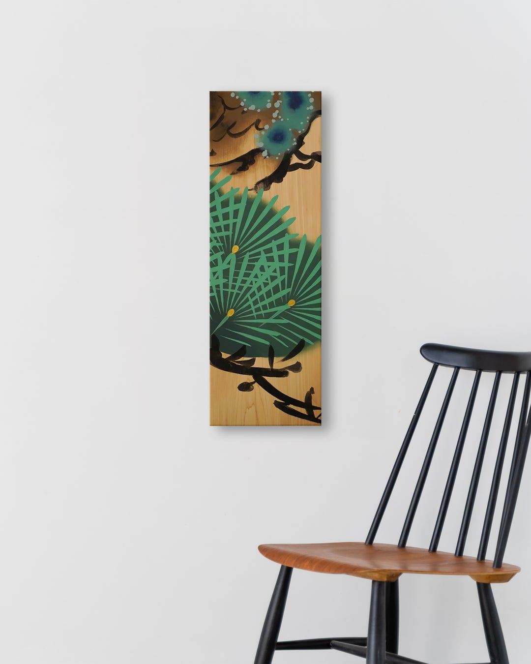 松羽目と呼ばれる能舞台の背景画を忠実に再現するため、実際の背景画と同じ縮尺で描かれ、ダイナミックかつ繊細な筆運びが特徴です。
