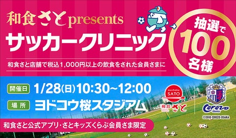 「和食さと」は、2024年1月28日にセレッソ大阪ヨドコウ桜スタジアムで「サッカークリニック」を開催します。