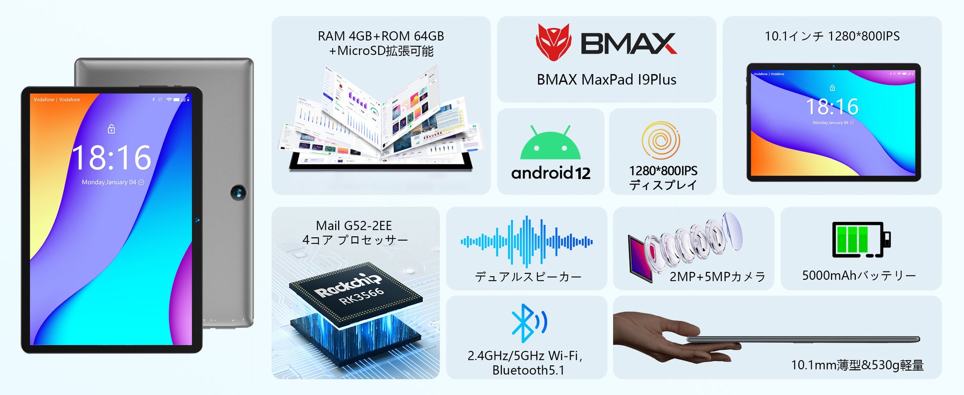 Amazonで販売されているBMAX MaxPad I9Plusは、Android 12システムを搭載し、4GB+64GBメモリに拡張され、画面分割表示機能やWiFi6モードをサポートしています。