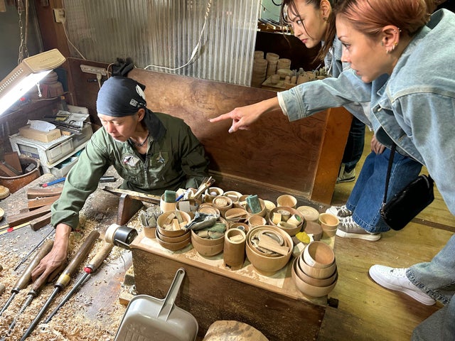 - 加賀の伝統工芸である山中塗りの木地挽き工房で酒器づくりを体験します。