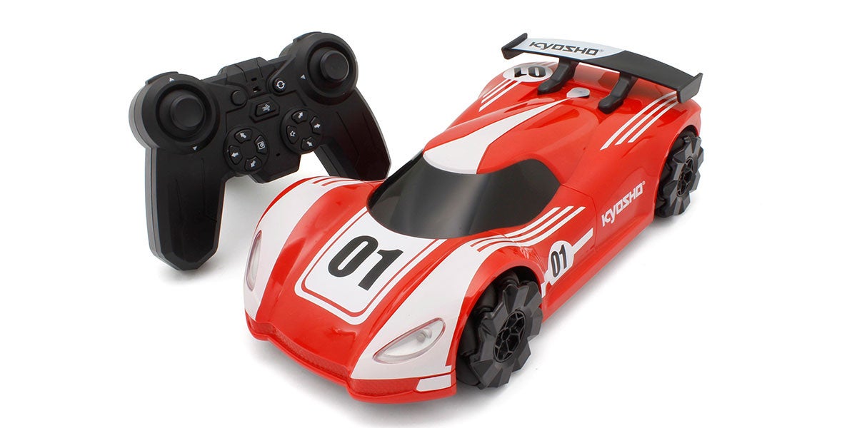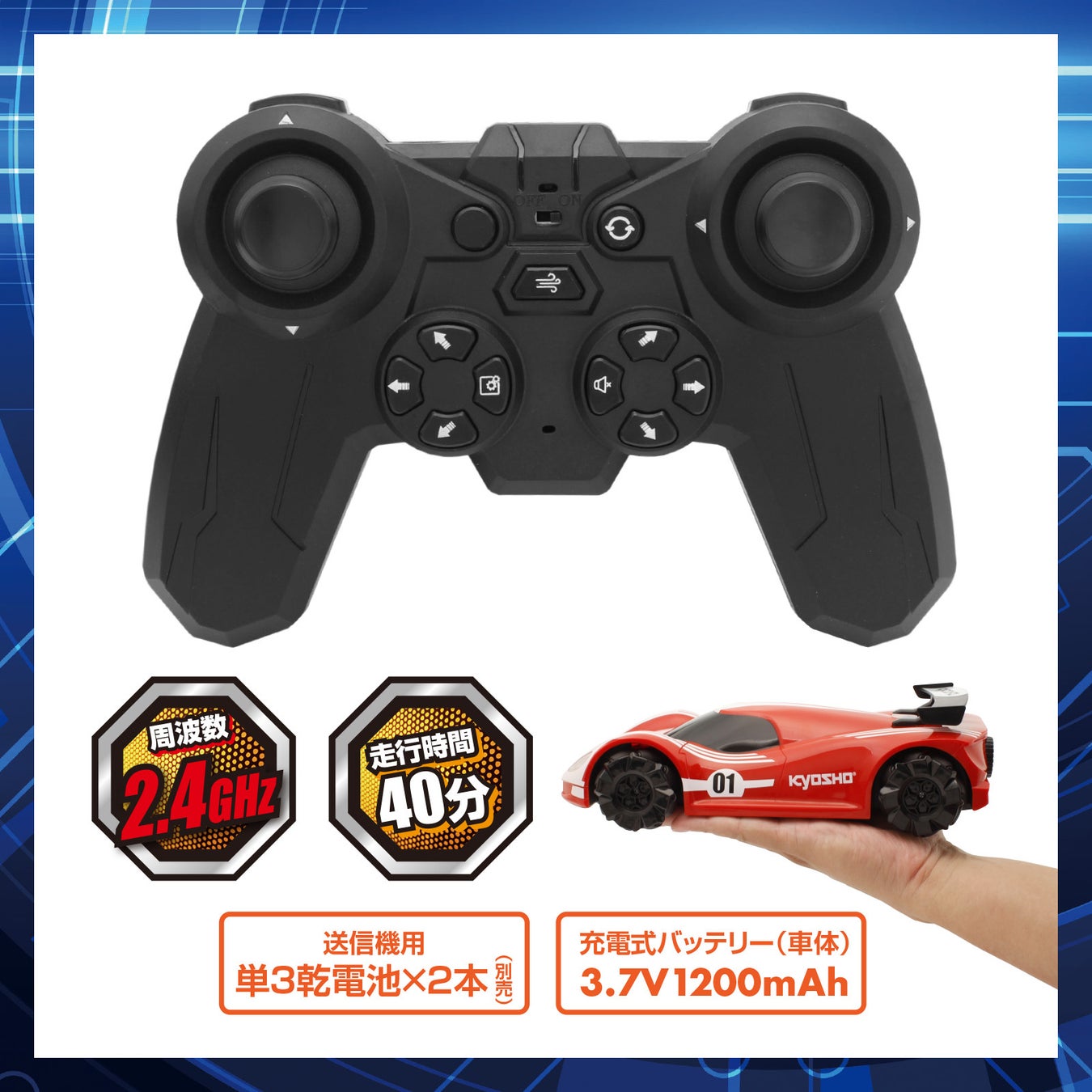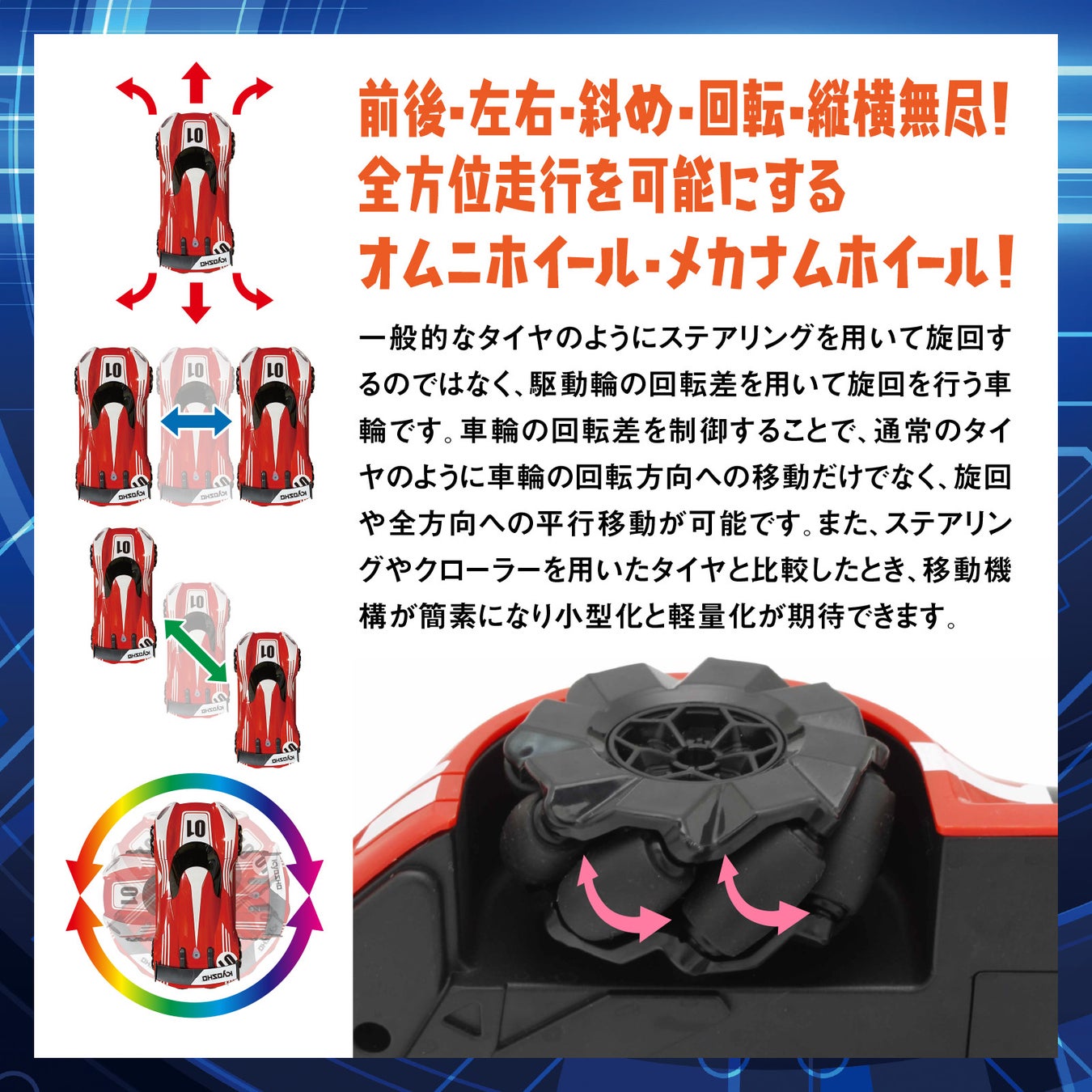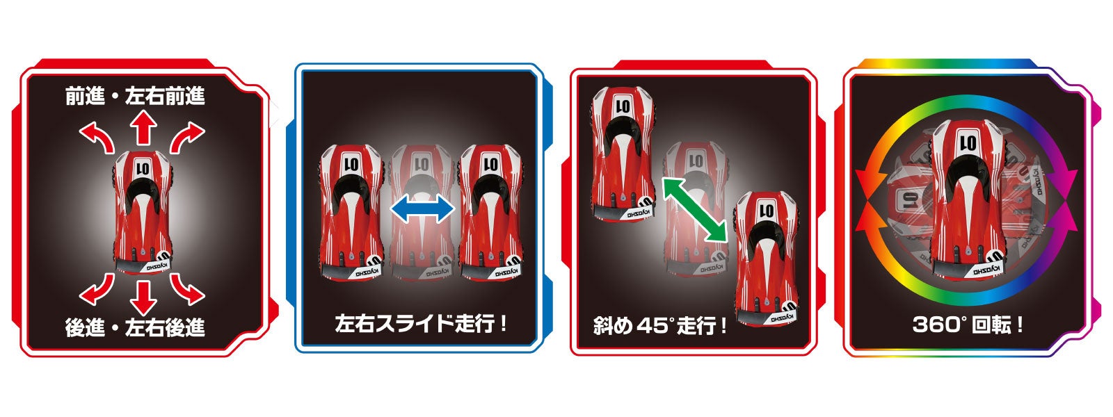 従来のR/Cカーの走行に加え、水平走行・斜め45°のスライド走行、そして360°回転もできる。