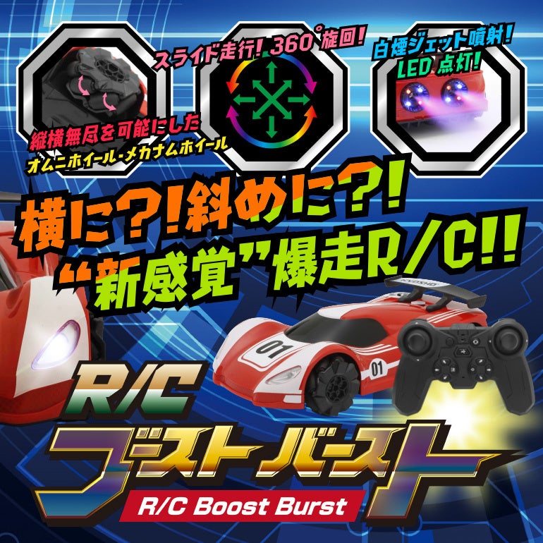 これまでのR/Cカーの走行のように、前進・後進・左右走行はもちろん、ゲームコントローラーのような2.4GHz送信機のファンクションボタンを押すことで、水平走行・斜め45°のスライド走行、そして360°回転もできる“新感覚”な爆走ラジオコントロールカー「R/C ブースト・バースト」の登場です。