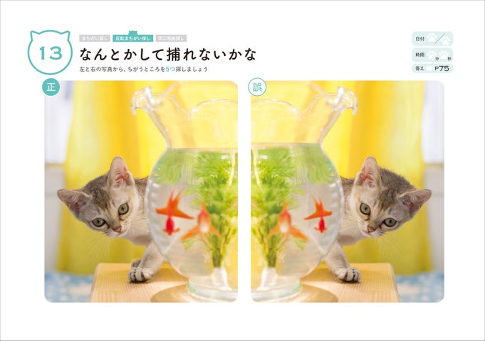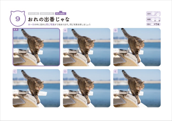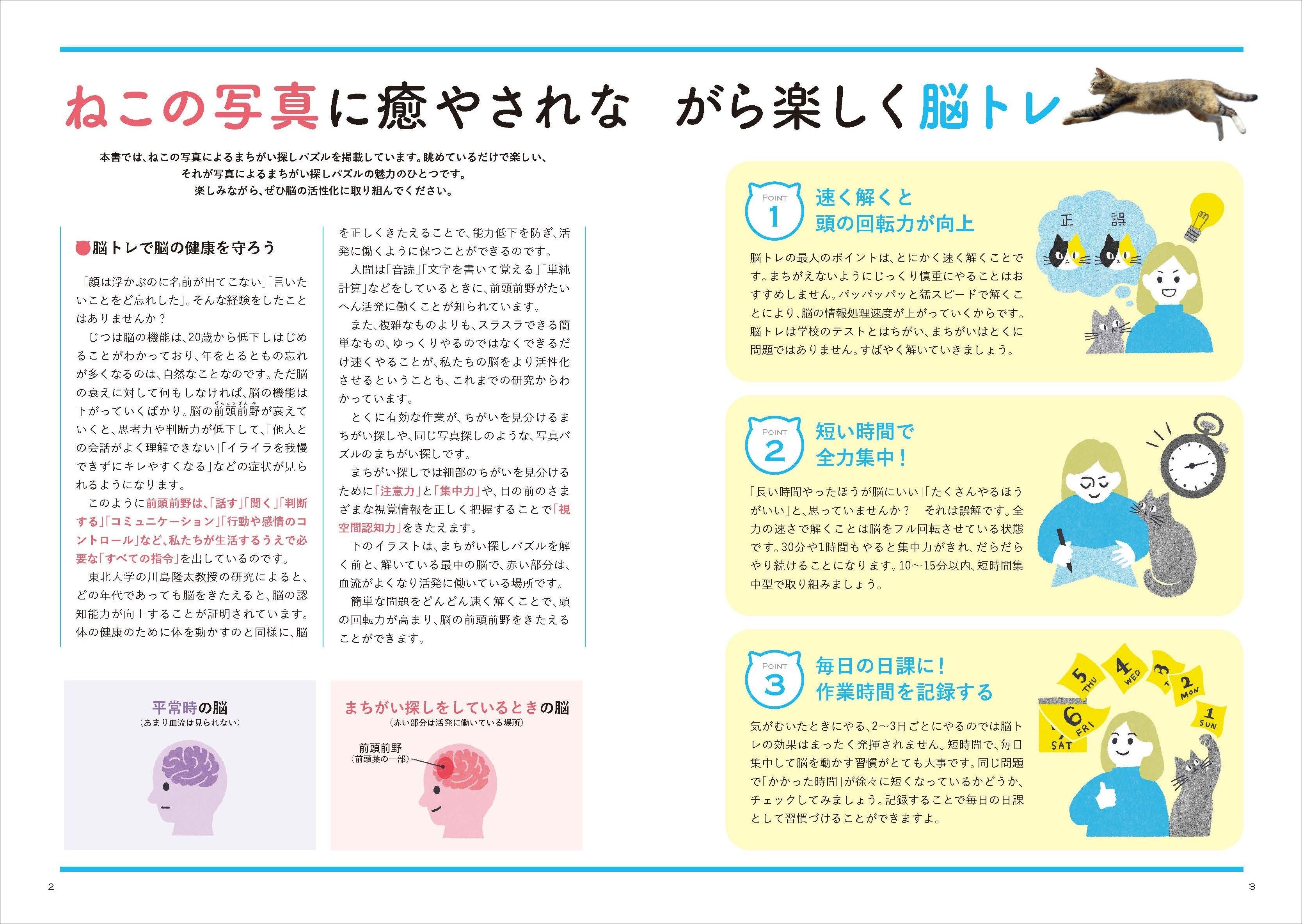 - 本は川島教授の監修による最新刊で、かわいいねこの写真を使ったまちがい探しのパズルが楽しめる