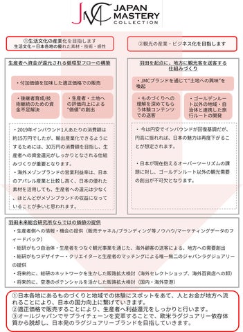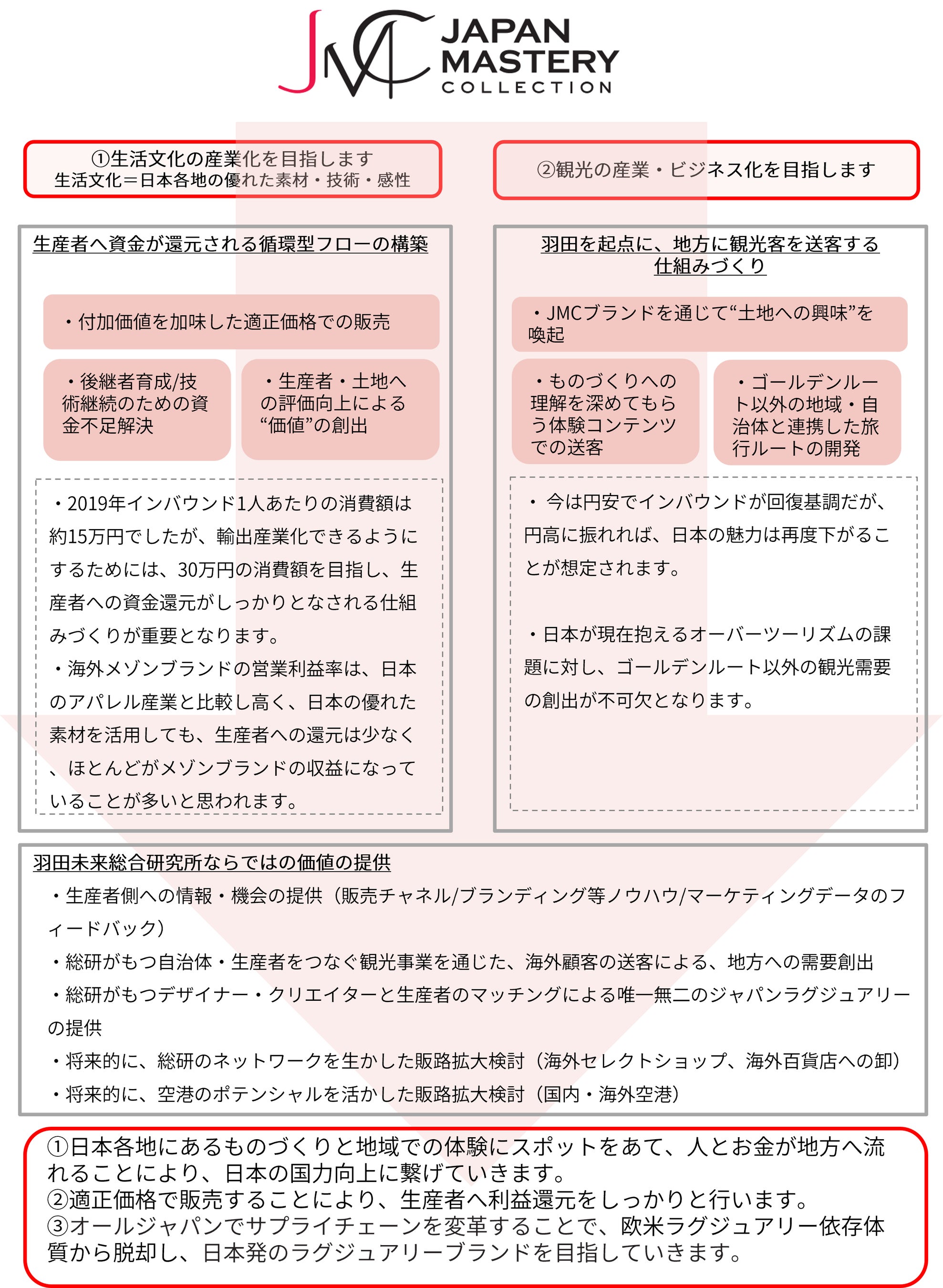 JMCは、日本のものづくりを産業化し、地方創生や日本発のラグジュアリーブランドの確立を目指しています。