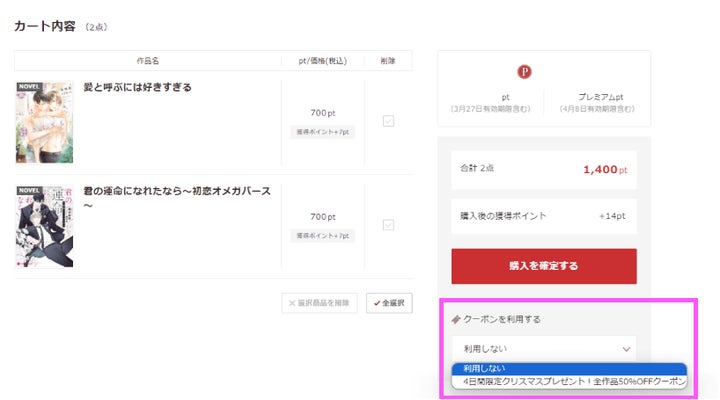 - La Roseraieでは、4日間限定で1000pt以上の購入で使える50%OFFクーポンをプレゼント