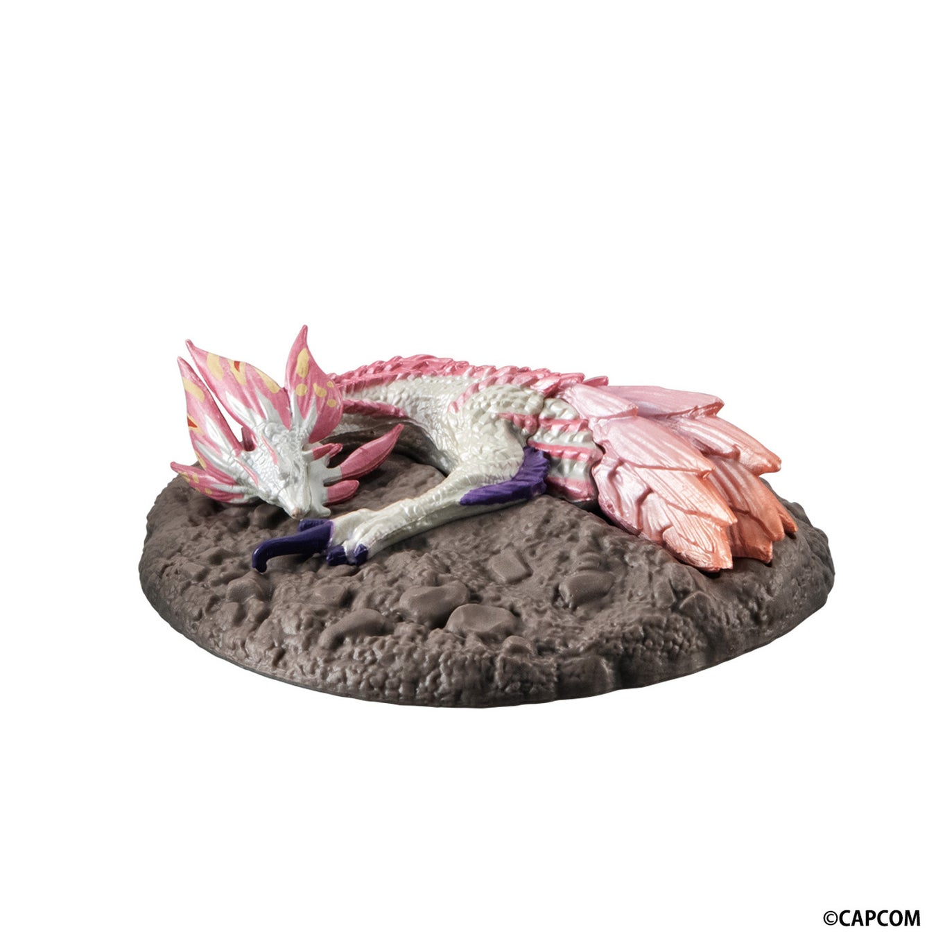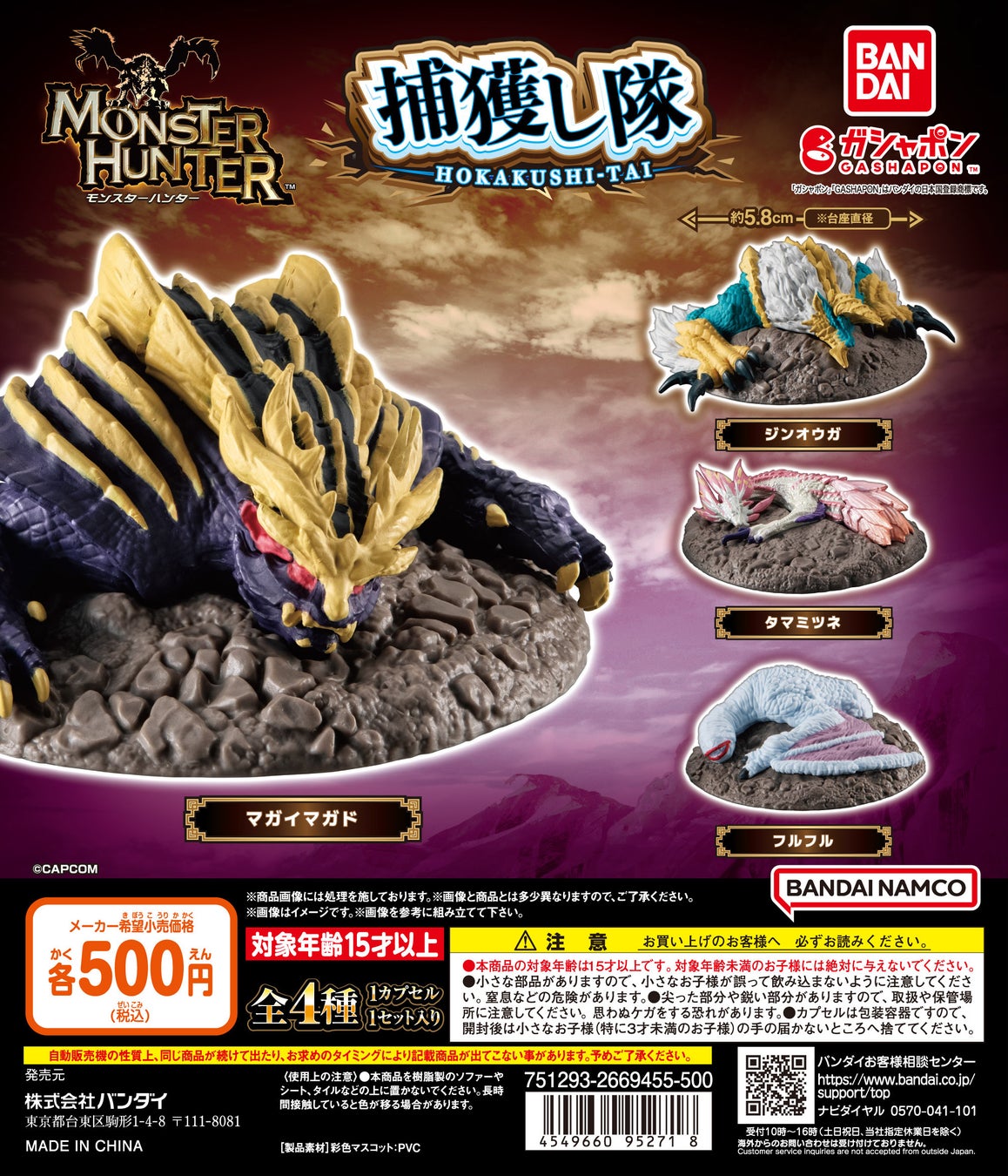 マガイマガド、ジンオウガ、タマミツネ、フルフルの4種類がラインナップされており、ミニチュアサイズながらもゲームの捕獲シーンをリアルに再現しています。