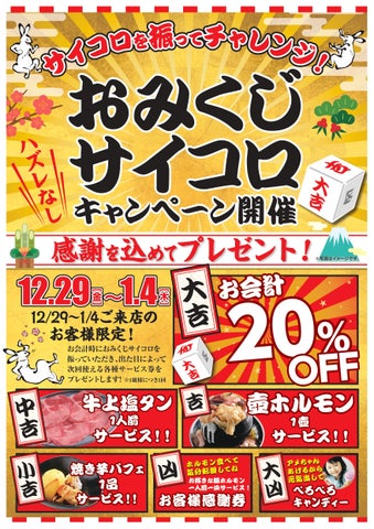 中部地区の「ホルモンとタンの専門店ほるたん屋」では、年末年始におみくじサイコロキャンペーンを開催します。