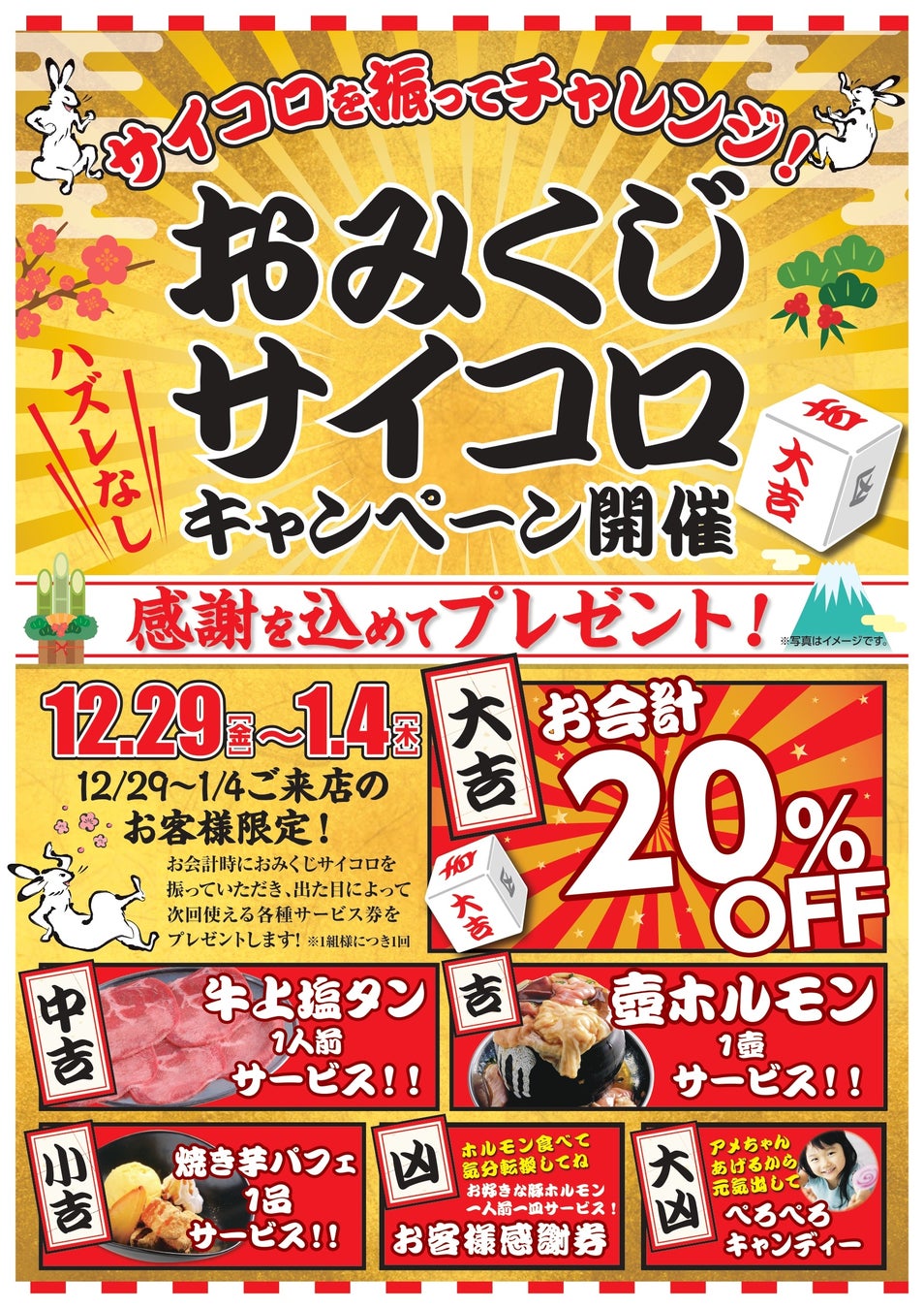 - 出た目に応じてサービス券プレゼント(20%オフ、牛上塩タン、はみ出る壺ホルモン、焼き芋パフェ、豚ホルモン、ぺろぺろキャンディー)