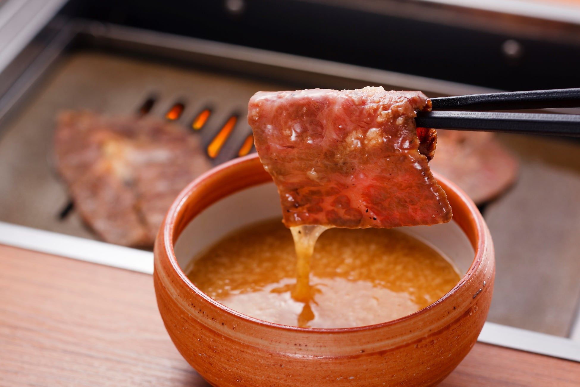 - サーロインとハラミを秘伝のタレで焼き、ご飯にもタレをかける