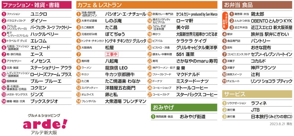- アルデひろば、カプセルトイショップ、岐阜購買部、トルテのさんぽ、高知の魚家さん、WESTERポイント、アルデ新大阪