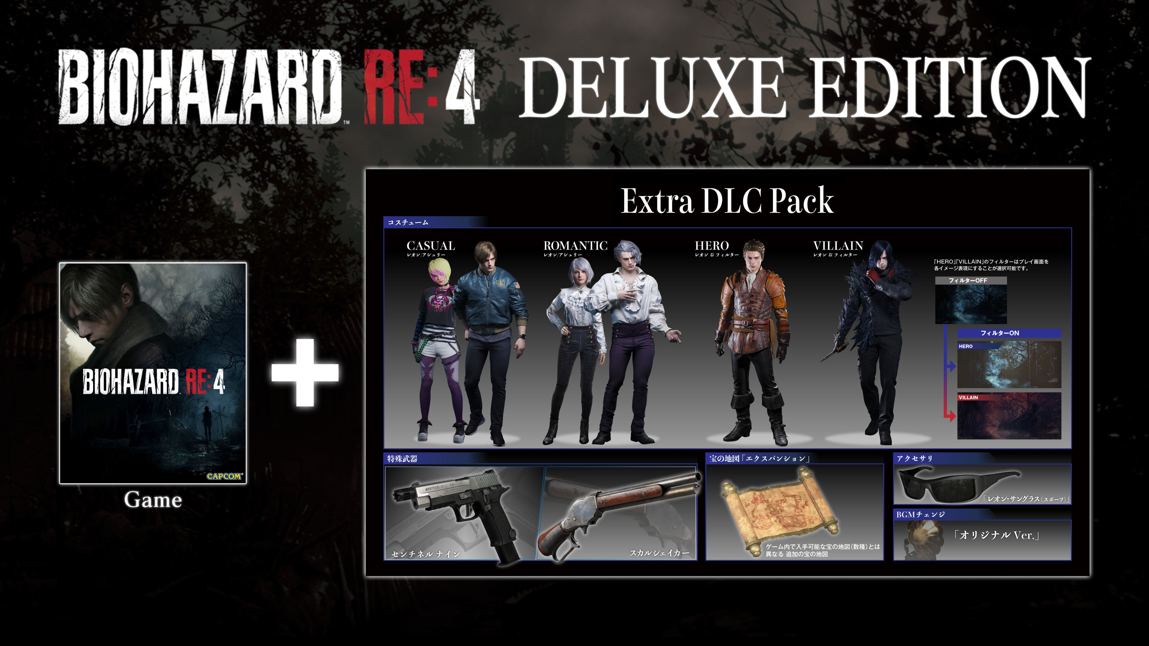 「エクストラDLCパック」には、コスチューム「レオン/アシュリー・CASUAL」、「レオン/アシュリー・ROMANTIC」、コスチューム&フィルター「レオン・HERO」、「レオン・VILAIN」、BGMチェンジ「オリジナル Ver.」、特別武器「センチネル ナイン」「スカルシェイカー」、アクセサリ「レオン・サングラス(スポーツ)」、宝の地図 「エクスパンション」とさらに深くゲームプレイを楽しむDLCが収録されている。スタンダード版をお持ちの方も「エクストラDLCパック」を購入すればこれらのコンテンツを楽しむ事ができる。