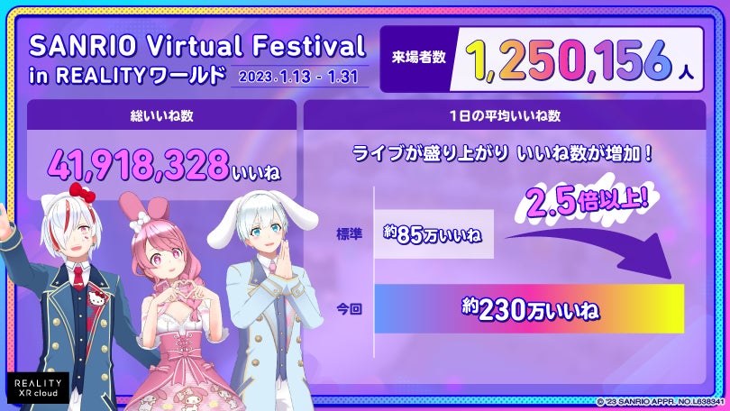 また、ライブ当日を含めて32のパフォーマンスを「サンリオVfes」上で配信し、2023年1月13日(金)から1月31日(水)までの19日間に、世界各国から約120万人のユーザーが来場し、スクリーンショット数も12万枚超を記録しました。さらに、期間中のREALITY配信者への総いいね数も4100万を超え、1日の平均いいね数も過去に提供したワールドと比較して2.5倍以上に増加し、配信者や視聴者の両方が会場さながらに盛り上がったことがわかりました。
