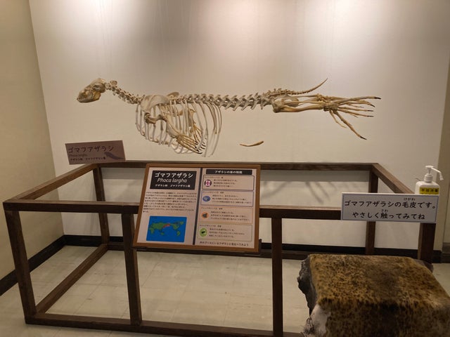 - ゴマフアザラシやサメハダホウズキイカなどの標本が展示される