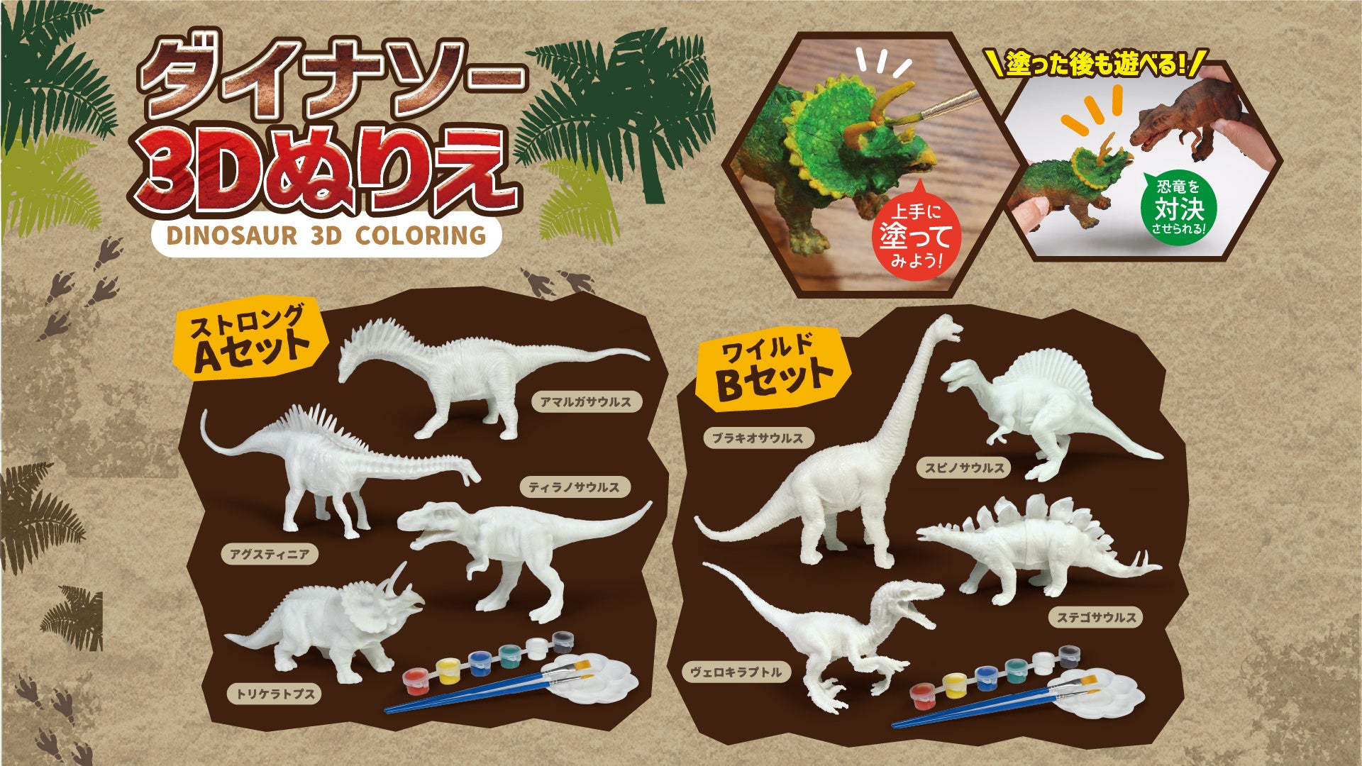 特徴:リアルな恐竜フィギュアをカラフルにペイントして楽しめる着色キット。「この恐竜何色だったんだろ?」と自分だけの発想で着色して楽しめる♪もちろん恐竜図鑑を見ながらリアルに再現しても楽しめます。ストロング恐竜シリーズとワイルド恐竜シリーズの全2種類が登場。