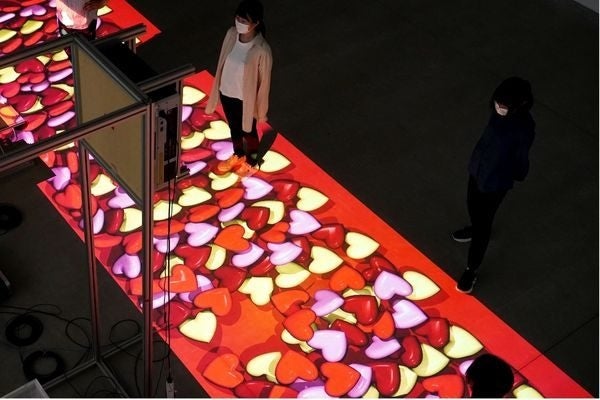 展示作品には、壁に向かってボールを投げると映像が広がる作品や、床面に投影された映像の上を歩いたり走ったりすることで映像が変化する作品があります。