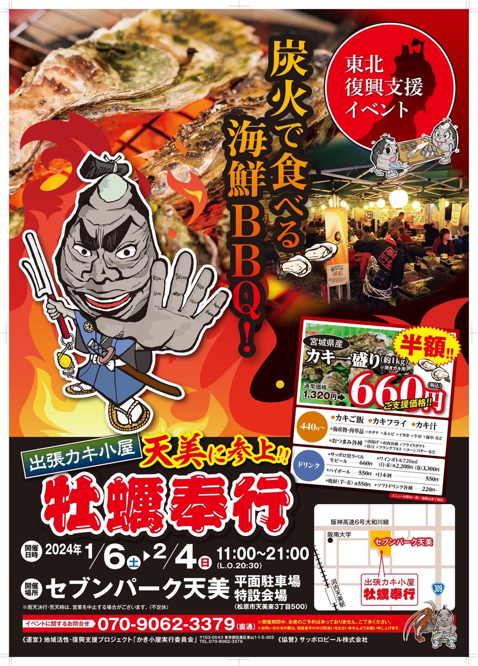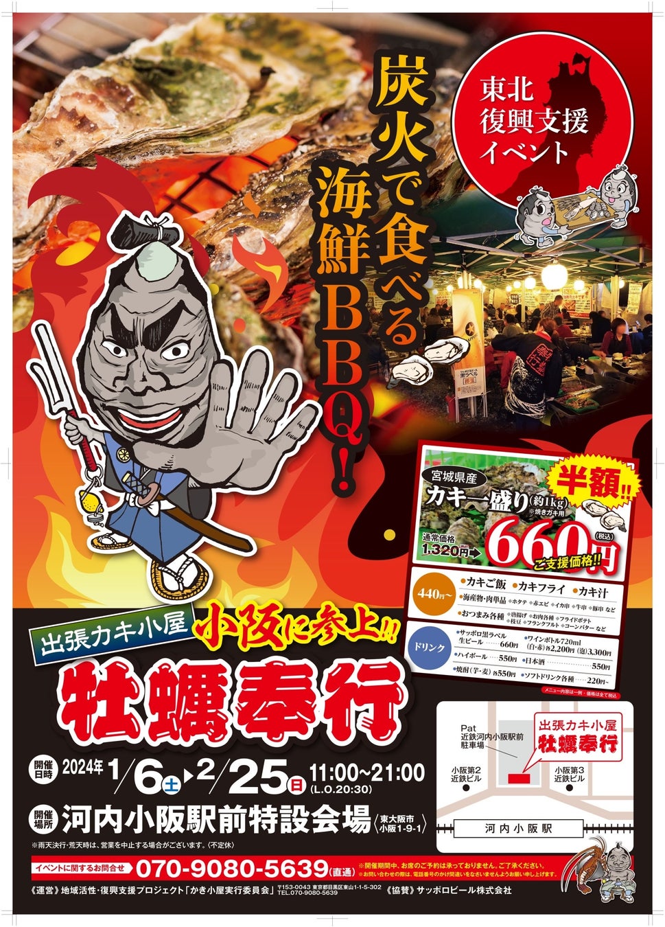 - 2012年から全国各地で開催されており、牡蠣は東北復興支援価格の半額で提供されています。