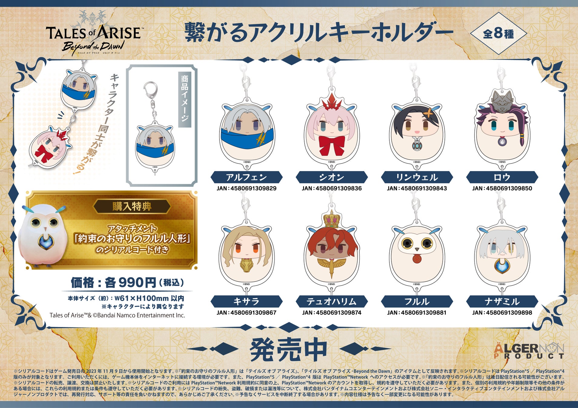 「テイルズ オブ アライズ ‐Beyond the Dawn 繋がるアクリルキーホルダー」では、フルルの着ぐるみを被ったキャラクターをモチーフにした新規描き起こしイラストが使用されています。